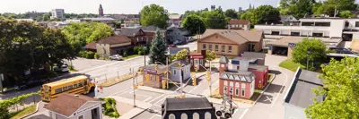 The Village itself is a child-sized replica of a community, featuring scaled-down streets, traffic signals, road signs, and buildings such as a city hall, fire hall, train station, and various businesses. It includes functioning traffic lights, railway crossing arms, and a phone booth for practicing 911 calls—offering a realistic yet controlled environment for safety learning.